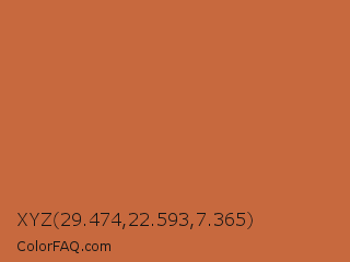 XYZ 29.474,22.593,7.365 Color is a normal orange color and the nearest color is Dark Coral #cd5b45. Hex code #c7693e and RGB value is rgb(199,105,62). In RGB color space, this color is composed of 78% red, 41% green, 24% blue, In CMYK color space, this color is composed of 0% cyan, 47% magenta, 69% yellow , 22% black , In HSL color space, this color has a hue angle of 19° , 55% saturation and 51% lightness.