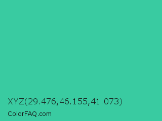 XYZ 29.476,46.155,41.073 Color is a normal green color and the nearest color is Shamrock #33cc99. Hex code #39cba1 and RGB value is rgb(57,203,161). In RGB color space, this color is composed of 22% red, 80% green, 63% blue, In CMYK color space, this color is composed of 72% cyan, 0% magenta, 21% yellow , 20% black , In HSL color space, this color has a hue angle of 163° , 58% saturation and 51% lightness.