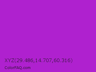 XYZ 29.486,14.707,60.316 Color is a normal purple color and the nearest color is Dark Orchid #9932cc. Hex code #af21cf and RGB value is rgb(175,33,207). In RGB color space, this color is composed of 69% red, 13% green, 81% blue, In CMYK color space, this color is composed of 15% cyan, 84% magenta, 0% yellow , 19% black , In HSL color space, this color has a hue angle of 289° , 73% saturation and 47% lightness.