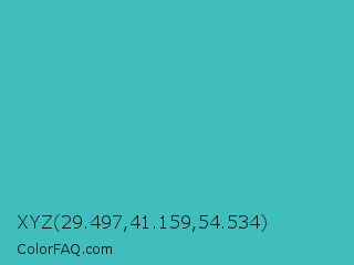 XYZ 29.497,41.159,54.534 Color is a normal cyan color and the nearest color is Maximum Blue Green #30bfbf. Hex code #40bdbd and RGB value is rgb(64,189,189). In RGB color space, this color is composed of 25% red, 74% green, 74% blue, In CMYK color space, this color is composed of 66% cyan, 0% magenta, 0% yellow , 26% black , In HSL color space, this color has a hue angle of 180° , 49% saturation and 50% lightness.