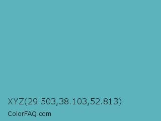 XYZ 29.503,38.103,52.813 Color is a normal cyan color and the nearest color is Fountain Blue #56b4be. Hex code #5cb3bb and RGB value is rgb(92,179,187). In RGB color space, this color is composed of 36% red, 70% green, 73% blue, In CMYK color space, this color is composed of 51% cyan, 4% magenta, 0% yellow , 27% black , In HSL color space, this color has a hue angle of 185° , 41% saturation and 55% lightness.