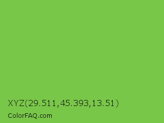 XYZ 29.511,45.393,13.51 Color is a normal green color and the nearest color is Mantis #74c365. Hex code #79c749 and RGB value is rgb(121,199,73). In RGB color space, this color is composed of 47% red, 78% green, 29% blue, In CMYK color space, this color is composed of 39% cyan, 0% magenta, 63% yellow , 22% black , In HSL color space, this color has a hue angle of 97° , 53% saturation and 53% lightness.