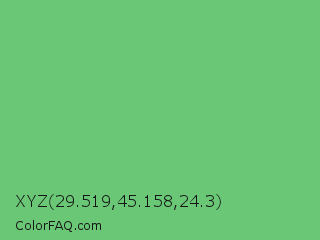XYZ 29.519,45.158,24.3 Color is a normal green color and the nearest color is Iguana Green #71bc78. Hex code #69c776 and RGB value is rgb(105,199,118). In RGB color space, this color is composed of 41% red, 78% green, 46% blue, In CMYK color space, this color is composed of 47% cyan, 0% magenta, 41% yellow , 22% black , In HSL color space, this color has a hue angle of 128° , 46% saturation and 60% lightness.