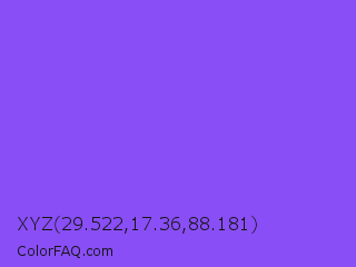 XYZ 29.522,17.36,88.181 Color is a light violet color and the nearest color is Navy Purple #9457eb. Hex code #894ef5 and RGB value is rgb(137,78,245). In RGB color space, this color is composed of 54% red, 31% green, 96% blue, In CMYK color space, this color is composed of 44% cyan, 68% magenta, 0% yellow , 4% black , In HSL color space, this color has a hue angle of 261° , 89% saturation and 63% lightness.