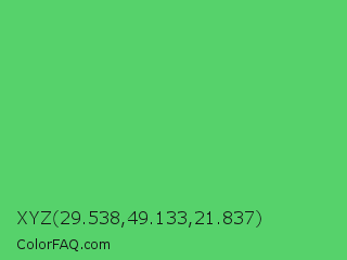 XYZ 29.538,49.133,21.837 Color is a normal green color and the nearest color is Emerald #50c878. Hex code #56d26b and RGB value is rgb(86,210,107). In RGB color space, this color is composed of 34% red, 82% green, 42% blue, In CMYK color space, this color is composed of 59% cyan, 0% magenta, 49% yellow , 18% black , In HSL color space, this color has a hue angle of 130° , 58% saturation and 58% lightness.