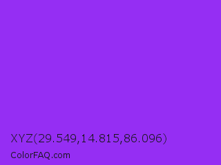 XYZ 29.549,14.815,86.096 Color is a normal purple color and the nearest color is Veronica #a020f0. Hex code #952ef3 and RGB value is rgb(149,46,243). In RGB color space, this color is composed of 58% red, 18% green, 95% blue, In CMYK color space, this color is composed of 39% cyan, 81% magenta, 0% yellow , 5% black , In HSL color space, this color has a hue angle of 271° , 89% saturation and 57% lightness.