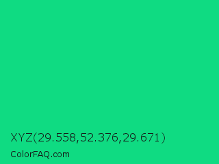 XYZ 29.558,52.376,29.671 Color is a normal green color and the nearest color is Caribbean Green #00cc99. Hex code #0fdb82 and RGB value is rgb(15,219,130). In RGB color space, this color is composed of 6% red, 86% green, 51% blue, In CMYK color space, this color is composed of 93% cyan, 0% magenta, 41% yellow , 14% black , In HSL color space, this color has a hue angle of 154° , 87% saturation and 46% lightness.