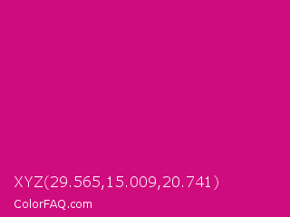 XYZ 29.565,15.009,20.741 Color is a normal magenta color and the nearest color is Red Violet #c71585. Hex code #cf0c7d and RGB value is rgb(207,12,125). In RGB color space, this color is composed of 81% red, 5% green, 49% blue, In CMYK color space, this color is composed of 0% cyan, 94% magenta, 40% yellow , 19% black , In HSL color space, this color has a hue angle of 325° , 89% saturation and 43% lightness.