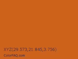 XYZ 29.573,21.845,3.756 Color is a normal orange color and the nearest color is Piper #c96323. Hex code #cc631c and RGB value is rgb(204,99,28). In RGB color space, this color is composed of 80% red, 39% green, 11% blue, In CMYK color space, this color is composed of 0% cyan, 51% magenta, 86% yellow , 20% black , In HSL color space, this color has a hue angle of 24° , 76% saturation and 45% lightness.
