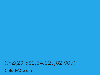 XYZ 29.581,34.321,82.907 Color is a normal blue color and the nearest color is Button Blue #24a0ed. Hex code #24a8ea and RGB value is rgb(36,168,234). In RGB color space, this color is composed of 14% red, 66% green, 92% blue, In CMYK color space, this color is composed of 85% cyan, 28% magenta, 0% yellow , 8% black , In HSL color space, this color has a hue angle of 200° , 83% saturation and 53% lightness.