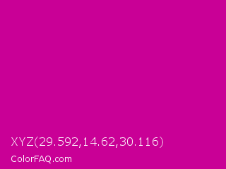 XYZ 29.592,14.62,30.116 Color is a normal magenta color and the nearest color is Red Violet #c71585. Hex code #c90096 and RGB value is rgb(201,0,150). In RGB color space, this color is composed of 79% red, 0% green, 59% blue, In CMYK color space, this color is composed of 0% cyan, 100% magenta, 25% yellow , 21% black , In HSL color space, this color has a hue angle of 315° , 100% saturation and 39% lightness.