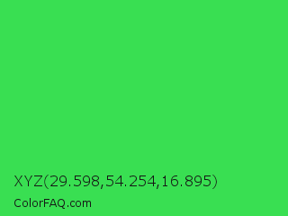 XYZ 29.598,54.254,16.895 Color is a normal green color and the nearest color is UFO Green #3cd070. Hex code #39df52 and RGB value is rgb(57,223,82). In RGB color space, this color is composed of 22% red, 87% green, 32% blue, In CMYK color space, this color is composed of 74% cyan, 0% magenta, 63% yellow , 13% black , In HSL color space, this color has a hue angle of 129° , 72% saturation and 55% lightness.