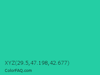 XYZ 29.5,47.198,42.677 Color is a normal cyan color and the nearest color is Shamrock #33cc99. Hex code #24cea4 and RGB value is rgb(36,206,164). In RGB color space, this color is composed of 14% red, 81% green, 64% blue, In CMYK color space, this color is composed of 83% cyan, 0% magenta, 20% yellow , 19% black , In HSL color space, this color has a hue angle of 165° , 70% saturation and 47% lightness.
