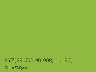 XYZ 29.602,40.908,11.186 Color is a normal green color and the nearest color is Sushi #87ab39. Hex code #8fb940 and RGB value is rgb(143,185,64). In RGB color space, this color is composed of 56% red, 73% green, 25% blue, In CMYK color space, this color is composed of 23% cyan, 0% magenta, 65% yellow , 27% black , In HSL color space, this color has a hue angle of 81° , 49% saturation and 49% lightness.