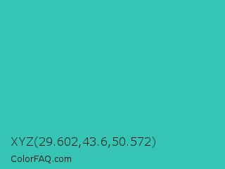 XYZ 29.602,43.6,50.572 Color is a normal cyan color and the nearest color is Maximum Blue Green #30bfbf. Hex code #36c4b5 and RGB value is rgb(54,196,181). In RGB color space, this color is composed of 21% red, 77% green, 71% blue, In CMYK color space, this color is composed of 72% cyan, 0% magenta, 8% yellow , 23% black , In HSL color space, this color has a hue angle of 174° , 57% saturation and 49% lightness.