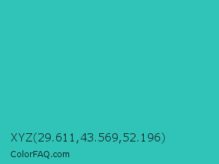XYZ 29.611,43.569,52.196 Color is a normal cyan color and the nearest color is Maximum Blue Green #30bfbf. Hex code #30c4b8 and RGB value is rgb(48,196,184). In RGB color space, this color is composed of 19% red, 77% green, 72% blue, In CMYK color space, this color is composed of 76% cyan, 0% magenta, 6% yellow , 23% black , In HSL color space, this color has a hue angle of 175° , 61% saturation and 48% lightness.