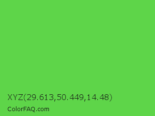 XYZ 29.613,50.449,14.48 Color is a normal green color and the nearest color is Mantis #74c365. Hex code #5ed549 and RGB value is rgb(94,213,73). In RGB color space, this color is composed of 37% red, 84% green, 29% blue, In CMYK color space, this color is composed of 56% cyan, 0% magenta, 66% yellow , 16% black , In HSL color space, this color has a hue angle of 111° , 63% saturation and 56% lightness.