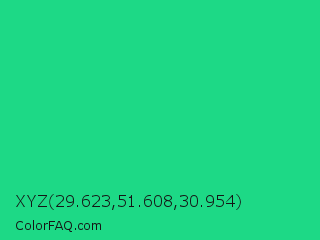 XYZ 29.623,51.608,30.954 Color is a normal green color and the nearest color is Shamrock #33cc99. Hex code #1dd986 and RGB value is rgb(29,217,134). In RGB color space, this color is composed of 11% red, 85% green, 53% blue, In CMYK color space, this color is composed of 87% cyan, 0% magenta, 38% yellow , 15% black , In HSL color space, this color has a hue angle of 154° , 76% saturation and 48% lightness.