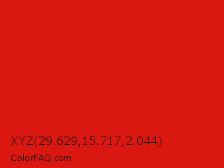 XYZ 29.629,15.717,2.044 Color is a normal red color and the nearest color is Maximum Red #d92121. Hex code #db1712 and RGB value is rgb(219,23,18). In RGB color space, this color is composed of 86% red, 9% green, 7% blue, In CMYK color space, this color is composed of 0% cyan, 89% magenta, 92% yellow , 14% black , In HSL color space, this color has a hue angle of 1° , 85% saturation and 46% lightness.