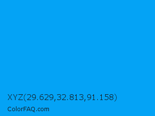 XYZ 29.629,32.813,91.158 Color is a normal blue color and the nearest color is Vivid Cerulean #00aaee. Hex code #04a3f5 and RGB value is rgb(4,163,245). In RGB color space, this color is composed of 2% red, 64% green, 96% blue, In CMYK color space, this color is composed of 98% cyan, 33% magenta, 0% yellow , 4% black , In HSL color space, this color has a hue angle of 200° , 97% saturation and 49% lightness.