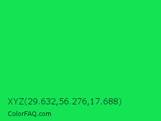 XYZ 29.632,56.276,17.688 Color is a normal green color and the nearest color is Malachite #0bda51. Hex code #14e454 and RGB value is rgb(20,228,84). In RGB color space, this color is composed of 8% red, 89% green, 33% blue, In CMYK color space, this color is composed of 91% cyan, 0% magenta, 63% yellow , 11% black , In HSL color space, this color has a hue angle of 138° , 84% saturation and 49% lightness.