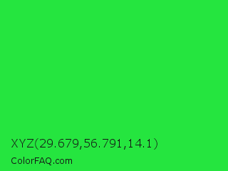 XYZ 29.679,56.791,14.1 Color is a normal green color and the nearest color is Lime Green #32cd32. Hex code #25e53f and RGB value is rgb(37,229,63). In RGB color space, this color is composed of 15% red, 90% green, 25% blue, In CMYK color space, this color is composed of 84% cyan, 0% magenta, 72% yellow , 10% black , In HSL color space, this color has a hue angle of 128° , 79% saturation and 52% lightness.