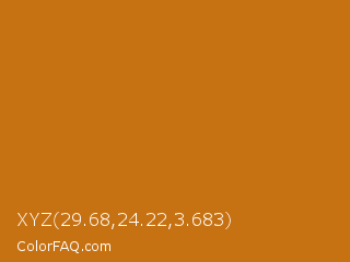 XYZ 29.68,24.22,3.683 Color is a normal orange color and the nearest color is Meteor #d07d12. Hex code #c77212 and RGB value is rgb(199,114,18). In RGB color space, this color is composed of 78% red, 45% green, 7% blue, In CMYK color space, this color is composed of 0% cyan, 43% magenta, 91% yellow , 22% black , In HSL color space, this color has a hue angle of 32° , 83% saturation and 43% lightness.