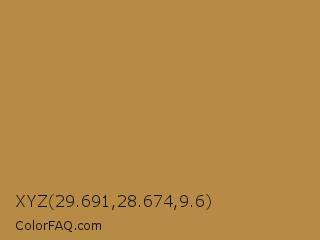 XYZ 29.691,28.674,9.6 Color is a normal orange color and the nearest color is Driftwood #af8751. Hex code #b78a45 and RGB value is rgb(183,138,69). In RGB color space, this color is composed of 72% red, 54% green, 27% blue, In CMYK color space, this color is composed of 0% cyan, 25% magenta, 62% yellow , 28% black , In HSL color space, this color has a hue angle of 36° , 45% saturation and 49% lightness.