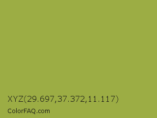 XYZ 29.697,37.372,11.117 Color is a normal yellow color and the nearest color is Sushi #87ab39. Hex code #9cad44 and RGB value is rgb(156,173,68). In RGB color space, this color is composed of 61% red, 68% green, 27% blue, In CMYK color space, this color is composed of 10% cyan, 0% magenta, 61% yellow , 32% black , In HSL color space, this color has a hue angle of 70° , 44% saturation and 47% lightness.