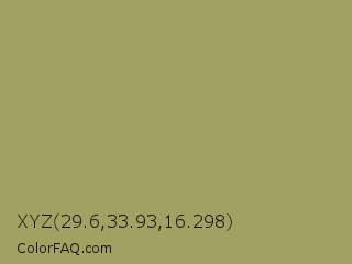 XYZ 29.6,33.93,16.298 Color is a normal yellow color and the nearest color is Green Smoke #a4af6e. Hex code #a1a161 and RGB value is rgb(161,161,97). In RGB color space, this color is composed of 63% red, 63% green, 38% blue, In CMYK color space, this color is composed of 0% cyan, 0% magenta, 40% yellow , 37% black , In HSL color space, this color has a hue angle of 60° , 25% saturation and 51% lightness.