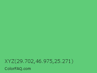 XYZ 29.702,46.975,25.271 Color is a normal green color and the nearest color is Emerald #50c878. Hex code #5fcc78 and RGB value is rgb(95,204,120). In RGB color space, this color is composed of 37% red, 80% green, 47% blue, In CMYK color space, this color is composed of 53% cyan, 0% magenta, 41% yellow , 20% black , In HSL color space, this color has a hue angle of 134° , 52% saturation and 59% lightness.