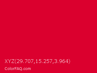 XYZ 29.707,15.257,3.964 Color is a normal red color and the nearest color is Medium Candy Apple Red #e2062c. Hex code #db002e and RGB value is rgb(219,0,46). In RGB color space, this color is composed of 86% red, 0% green, 18% blue, In CMYK color space, this color is composed of 0% cyan, 100% magenta, 79% yellow , 14% black , In HSL color space, this color has a hue angle of 347° , 100% saturation and 43% lightness.