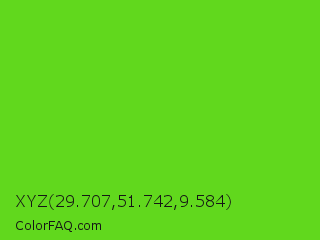 XYZ 29.707,51.742,9.584 Color is a normal green color and the nearest color is Harlequin Green #46cb18. Hex code #61d81d and RGB value is rgb(97,216,29). In RGB color space, this color is composed of 38% red, 85% green, 11% blue, In CMYK color space, this color is composed of 55% cyan, 0% magenta, 87% yellow , 15% black , In HSL color space, this color has a hue angle of 98° , 76% saturation and 48% lightness.