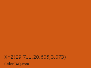 XYZ 29.711,20.605,3.073 Color is a normal orange color and the nearest color is Orange Roughy #c45719. Hex code #d05914 and RGB value is rgb(208,89,20). In RGB color space, this color is composed of 82% red, 35% green, 8% blue, In CMYK color space, this color is composed of 0% cyan, 57% magenta, 90% yellow , 18% black , In HSL color space, this color has a hue angle of 22° , 82% saturation and 45% lightness.
