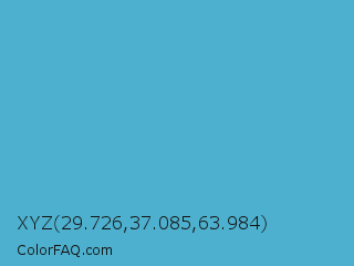 XYZ 29.726,37.085,63.984 Color is a normal blue color and the nearest color is Shakespeare #4eabd1. Hex code #4db0ce and RGB value is rgb(77,176,206). In RGB color space, this color is composed of 30% red, 69% green, 81% blue, In CMYK color space, this color is composed of 63% cyan, 15% magenta, 0% yellow , 19% black , In HSL color space, this color has a hue angle of 194° , 57% saturation and 55% lightness.