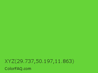 XYZ 29.737,50.197,11.863 Color is a normal green color and the nearest color is Green RYB #66b032. Hex code #66d438 and RGB value is rgb(102,212,56). In RGB color space, this color is composed of 40% red, 83% green, 22% blue, In CMYK color space, this color is composed of 52% cyan, 0% magenta, 74% yellow , 17% black , In HSL color space, this color has a hue angle of 102° , 64% saturation and 53% lightness.