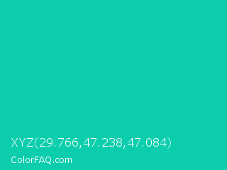 XYZ 29.766,47.238,47.084 Color is a normal cyan color and the nearest color is Amazonite #00c4b0. Hex code #0ccead and RGB value is rgb(12,206,173). In RGB color space, this color is composed of 5% red, 81% green, 68% blue, In CMYK color space, this color is composed of 94% cyan, 0% magenta, 16% yellow , 19% black , In HSL color space, this color has a hue angle of 170° , 89% saturation and 43% lightness.
