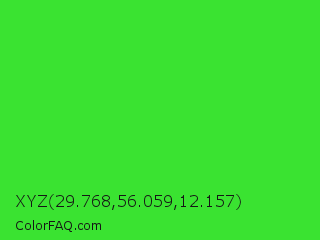 XYZ 29.768,56.059,12.157 Color is a normal green color and the nearest color is Lime Green #32cd32. Hex code #3ae331 and RGB value is rgb(58,227,49). In RGB color space, this color is composed of 23% red, 89% green, 19% blue, In CMYK color space, this color is composed of 74% cyan, 0% magenta, 78% yellow , 11% black , In HSL color space, this color has a hue angle of 117° , 76% saturation and 54% lightness.