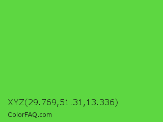 XYZ 29.769,51.31,13.336 Color is a normal green color and the nearest color is Green RYB #66b032. Hex code #5dd741 and RGB value is rgb(93,215,65). In RGB color space, this color is composed of 36% red, 84% green, 25% blue, In CMYK color space, this color is composed of 57% cyan, 0% magenta, 70% yellow , 16% black , In HSL color space, this color has a hue angle of 109° , 65% saturation and 55% lightness.