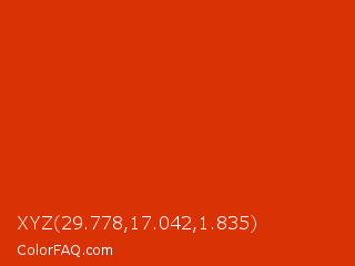 XYZ 29.778,17.042,1.835 Color is a normal red color and the nearest color is Grenadier #d54600. Hex code #d93204 and RGB value is rgb(217,50,4). In RGB color space, this color is composed of 85% red, 20% green, 2% blue, In CMYK color space, this color is composed of 0% cyan, 77% magenta, 98% yellow , 15% black , In HSL color space, this color has a hue angle of 13° , 96% saturation and 43% lightness.