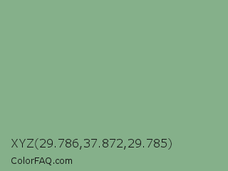 XYZ 29.786,37.872,29.785 Color is a light green color and the nearest color is Bay Leaf #7da98d. Hex code #85b08a and RGB value is rgb(133,176,138). In RGB color space, this color is composed of 52% red, 69% green, 54% blue, In CMYK color space, this color is composed of 24% cyan, 0% magenta, 22% yellow , 31% black , In HSL color space, this color has a hue angle of 127° , 21% saturation and 61% lightness.