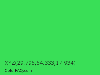 XYZ 29.795,54.333,17.934 Color is a normal green color and the nearest color is UFO Green #3cd070. Hex code #39df57 and RGB value is rgb(57,223,87). In RGB color space, this color is composed of 22% red, 87% green, 34% blue, In CMYK color space, this color is composed of 74% cyan, 0% magenta, 61% yellow , 13% black , In HSL color space, this color has a hue angle of 131° , 72% saturation and 55% lightness.