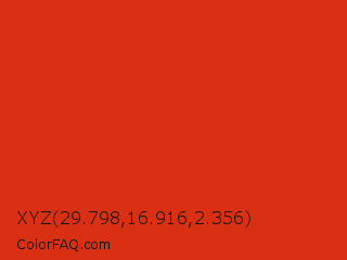 XYZ 29.798,16.916,2.356 Color is a normal red color and the nearest color is Vermilion #d9381e. Hex code #d93014 and RGB value is rgb(217,48,20). In RGB color space, this color is composed of 85% red, 19% green, 8% blue, In CMYK color space, this color is composed of 0% cyan, 78% magenta, 91% yellow , 15% black , In HSL color space, this color has a hue angle of 9° , 83% saturation and 46% lightness.