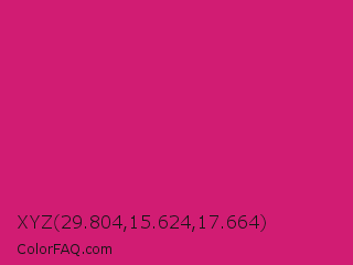 XYZ 29.804,15.624,17.664 Color is a normal rose color and the nearest color is Magenta Dye #ca1f7b. Hex code #d11c73 and RGB value is rgb(209,28,115). In RGB color space, this color is composed of 82% red, 11% green, 45% blue, In CMYK color space, this color is composed of 0% cyan, 87% magenta, 45% yellow , 18% black , In HSL color space, this color has a hue angle of 331° , 76% saturation and 46% lightness.