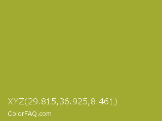 XYZ 29.815,36.925,8.461 Color is a normal yellow color and the nearest color is Citron #9fa91f. Hex code #a1ab31 and RGB value is rgb(161,171,49). In RGB color space, this color is composed of 63% red, 67% green, 19% blue, In CMYK color space, this color is composed of 6% cyan, 0% magenta, 71% yellow , 33% black , In HSL color space, this color has a hue angle of 65° , 55% saturation and 43% lightness.