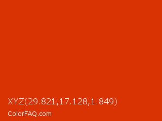 XYZ 29.821,17.128,1.849 Color is a normal red color and the nearest color is Grenadier #d54600. Hex code #d93304 and RGB value is rgb(217,51,4). In RGB color space, this color is composed of 85% red, 20% green, 2% blue, In CMYK color space, this color is composed of 0% cyan, 76% magenta, 98% yellow , 15% black , In HSL color space, this color has a hue angle of 13° , 96% saturation and 43% lightness.