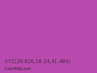 XYZ 29.826,18.24,41.484 Color is a normal magenta color and the nearest color is Fuchsia Pink #c154c1. Hex code #b84bad and RGB value is rgb(184,75,173). In RGB color space, this color is composed of 72% red, 29% green, 68% blue, In CMYK color space, this color is composed of 0% cyan, 59% magenta, 6% yellow , 28% black , In HSL color space, this color has a hue angle of 306° , 43% saturation and 51% lightness.