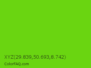XYZ 29.839,50.693,8.742 Color is a normal green color and the nearest color is Lima #76bd17. Hex code #6ad511 and RGB value is rgb(106,213,17). In RGB color space, this color is composed of 42% red, 84% green, 7% blue, In CMYK color space, this color is composed of 50% cyan, 0% magenta, 92% yellow , 16% black , In HSL color space, this color has a hue angle of 93° , 85% saturation and 45% lightness.