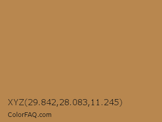 XYZ 29.842,28.083,11.245 Color is a normal orange color and the nearest color is Driftwood #af8751. Hex code #b8874f and RGB value is rgb(184,135,79). In RGB color space, this color is composed of 72% red, 53% green, 31% blue, In CMYK color space, this color is composed of 0% cyan, 27% magenta, 57% yellow , 28% black , In HSL color space, this color has a hue angle of 32° , 43% saturation and 52% lightness.
