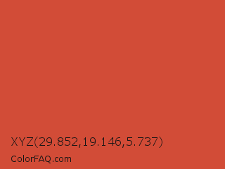 XYZ 29.852,19.146,5.737 Color is a normal red color and the nearest color is Valencia #d84437. Hex code #d24c37 and RGB value is rgb(210,76,55). In RGB color space, this color is composed of 82% red, 30% green, 22% blue, In CMYK color space, this color is composed of 0% cyan, 64% magenta, 74% yellow , 18% black , In HSL color space, this color has a hue angle of 8° , 63% saturation and 52% lightness.